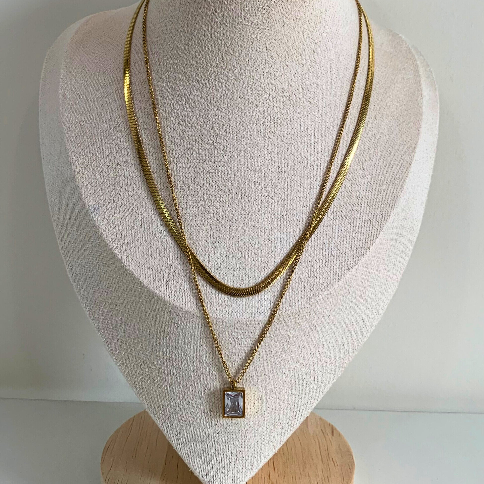 A chic double-layer necklace featuring a sleek rectangle stone pendant paired with a delicate plain chain, perfect for modern elegance. This piece is Anti-Tarnish, Sweat-Proof, Water-Proof, Hypoallergenic. Elevate your look with Premium quality Dâvina Necklace.